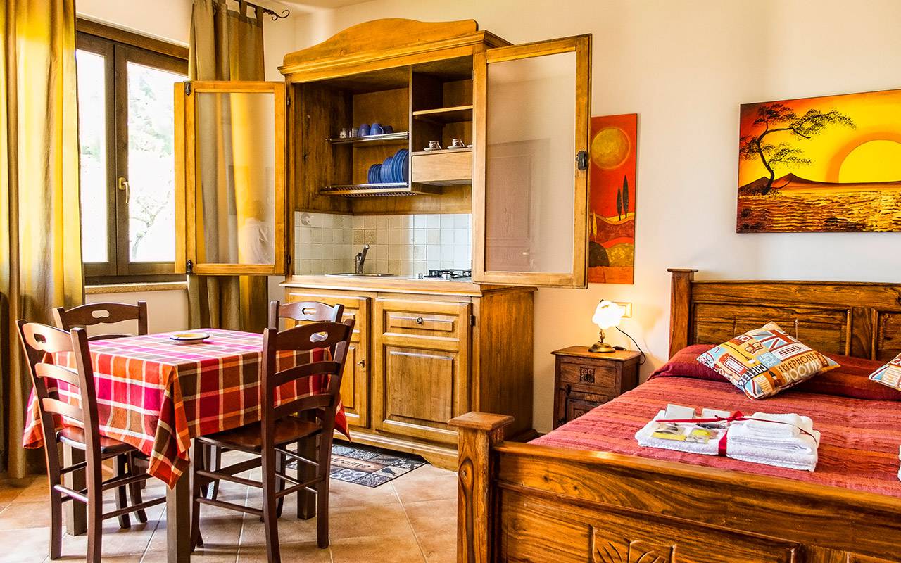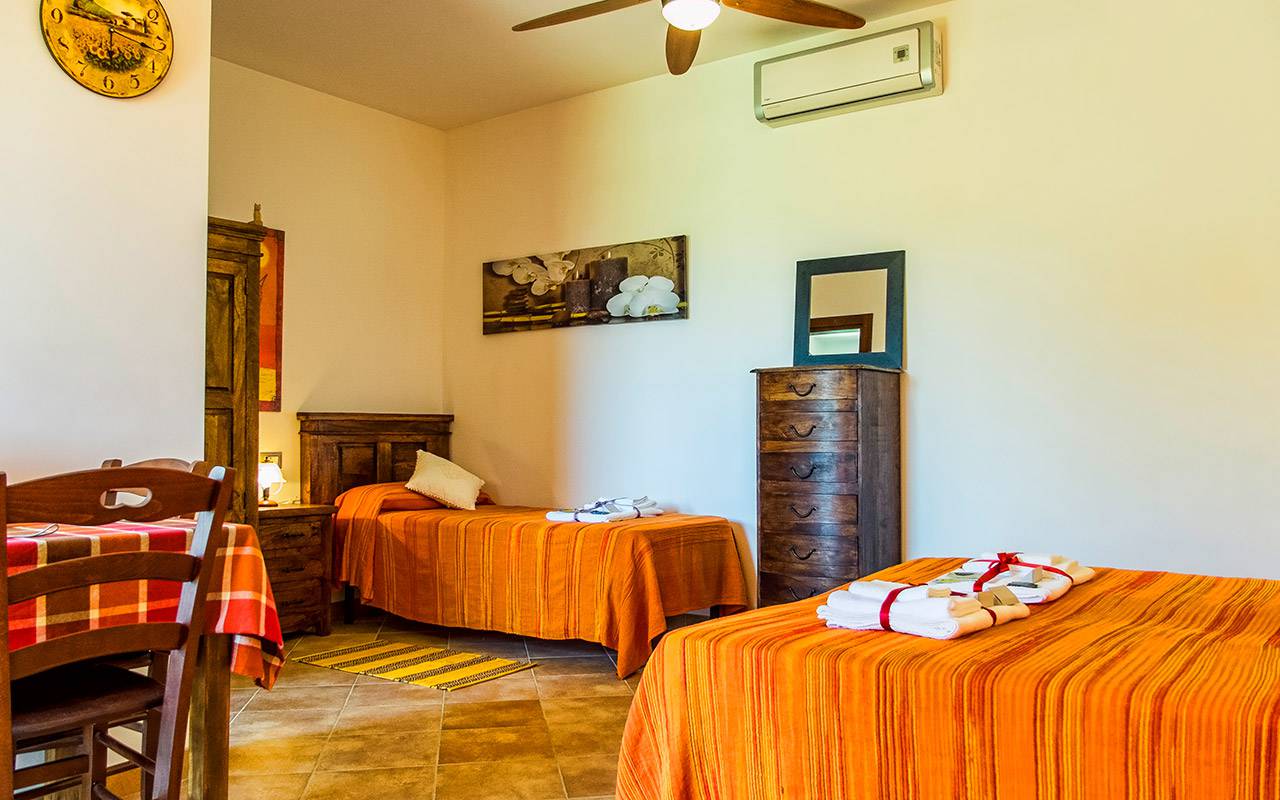 Dotata di letto matrimoniale e letto singolo, entrambi in legno massello, come tutto il resto dell’arredamento. Provvista di un simpatico angolo cottura accessoriato, costituito da un mobile in legno con all’interno una cucinetta rivestita con piastrelle di ceramica. Ingresso autonomo situato al piano terra, bagno privato, aria condizionata e ventola a soffitto. Esposizione ad Ovest.